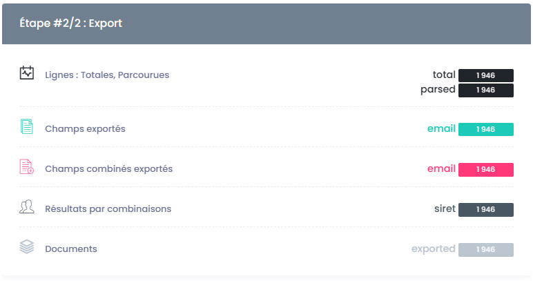 Champs exportés : détaille le volume de données exportables par champs à extraire sélectionnés lors du paramétrage de votre enrichissement.