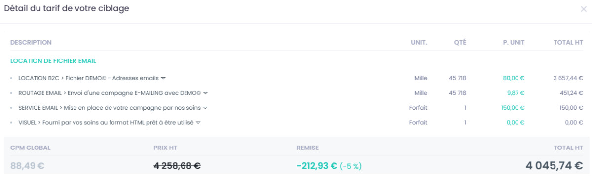Le volume de contacts ciblés, ainsi que le tarif associé, vont alors s'actualiser dans le cartouche de validation, en fonction des paramètres sélectionnés.