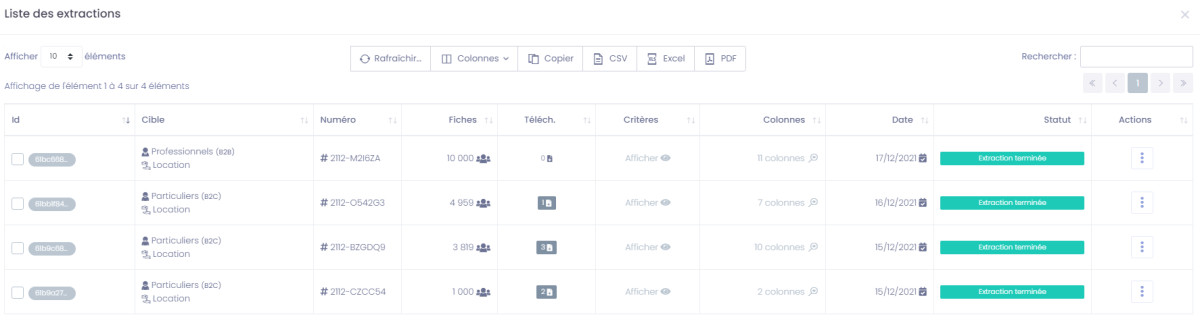 Depuis votre espace utilisateur, vous pouvez retrouver l'ensemble de vos extractions.